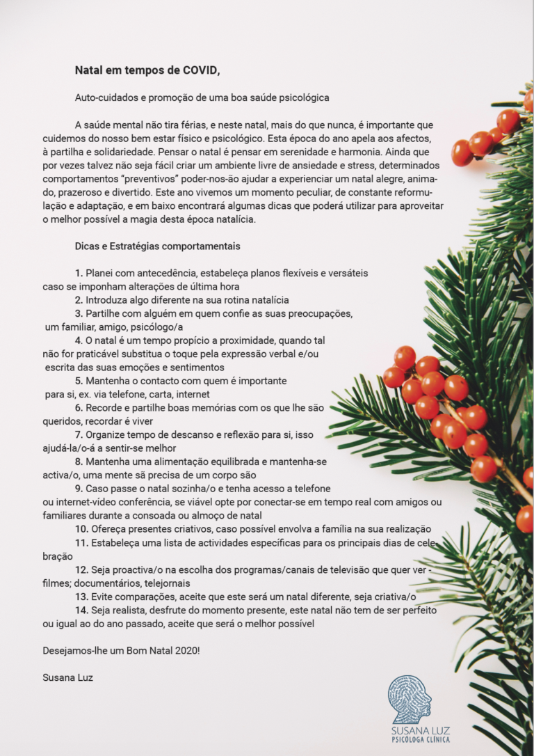 A saúde mental não tira férias, e neste natal, mais do que nunca, é importante que cuidemos do nosso bem estar físico e psicológico. Esta época do ano apela aos afectos, à partilha e...